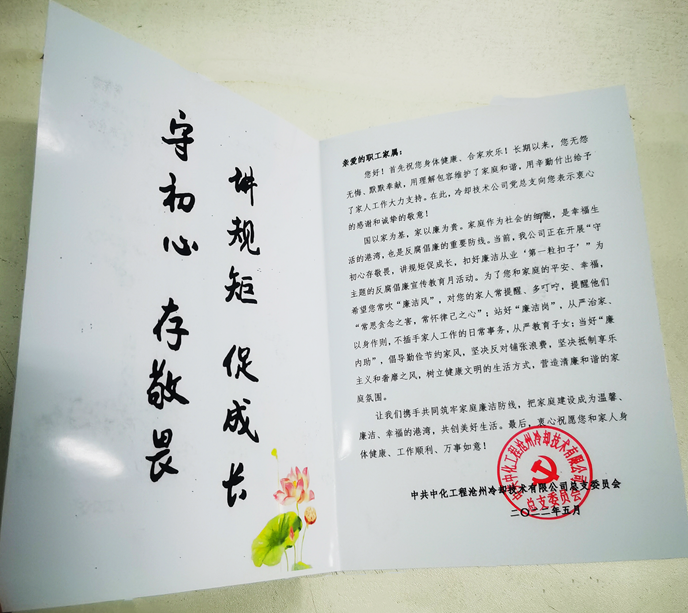 为扎实开展“反腐倡廉宣传教育月”活动,引导青年干部扣好廉洁从业“第一粒扣子”,更好地发挥家庭在助廉教育中的积极作用,培育清廉家风,筑牢反腐倡廉家庭防线,公司党总支开展“家庭助廉”送寄语活动,制作了家庭助廉寄语卡片,为青年干部家庭送去党组织的关怀和爱护。